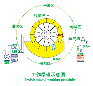 吸漿區(qū):工作時浸沒在料漿的過濾板在毛細作用下結(jié)合真空壓力,表面吸附成一層濾餅,濾液通過濾板進分配閥至排液罐。